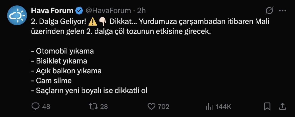 Hava Forum, bugün itibarıyla yurdu yeni bir çöl tozu dalgasının saracağını duyurdu.