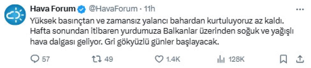 "Yüksek basınçtan ve zamansız yalancı bahardan kurtuluyoruz az kaldı. Hafta sonundan itibaren yurdumuza Balkanlar üzerinden soğuk ve yağışlı hava dalgası geliyor. Gri gökyüzlü günler başlayacak."