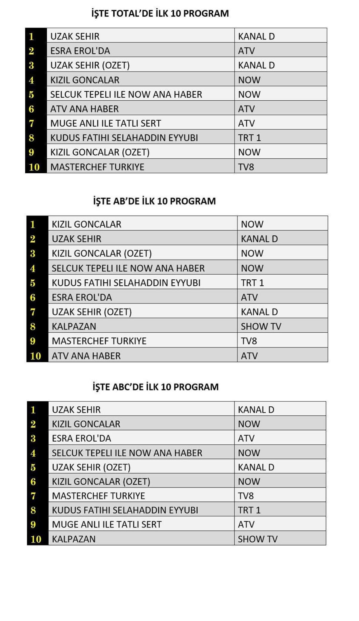 Her gün bir önceki güne ait Total, AB ve ABC sıralaması belli olurken dünün reyting sonuçları merakla bekleniyor.