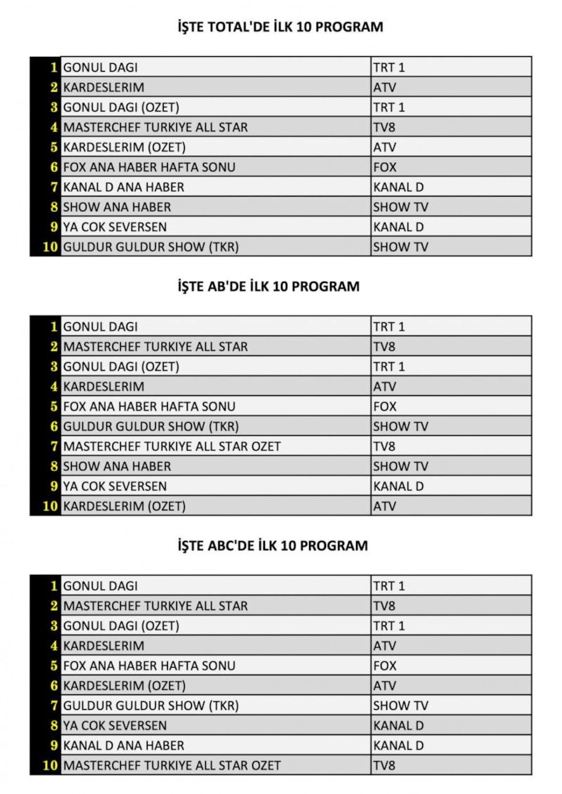 Her gün bir önceki güne ait Total, AB ve ABC sıralaması belli olurken dünün reyting sonuçları merakla bekleniyor.