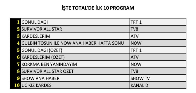 Total'de reyting listesinin ilk sırasında Gönül Dağı, ikinci sırada Survivor All Star, üçüncü sırada ise Kardeşlerim yer aldı.