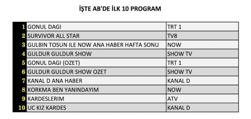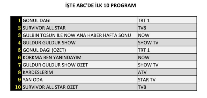 AB'de birinci sırada Gönül Dağı, ikinci sırada Survivor All Star, üçüncü sırada Gülbin Tosun ile NOW Ana Haber Hafta Sonu yer aldı.