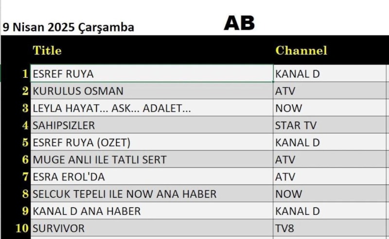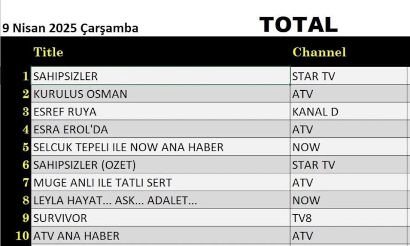 9 NİSAN ÇARŞAMBA REYTİNG SONUÇLARI