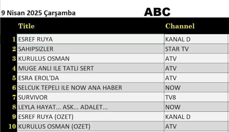 Her gün bir önceki güne ait Total, AB ve ABC sıralaması belli olurken dünün reyting sonuçları merakla bekleniyor.