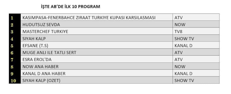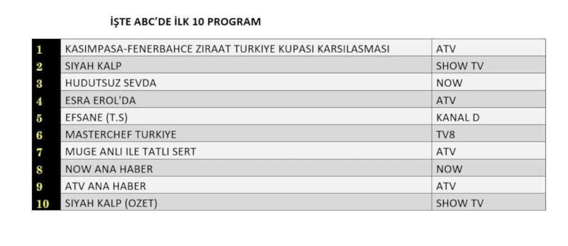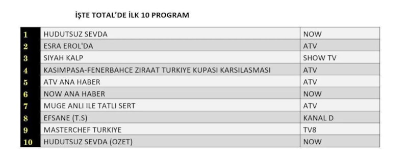 Her gün bir önceki güne ait Total, AB ve ABC sıralaması belli olurken dünün reyting sonuçları merakla bekleniyor.