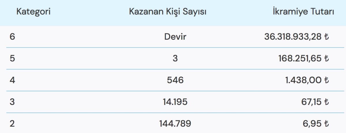 Büyük ikramiyenin 36.318.933,28 TL olduğu gecede 6 bilen çıkmadığı için büyük ikramiye bir sonraki çekilişe devretti.