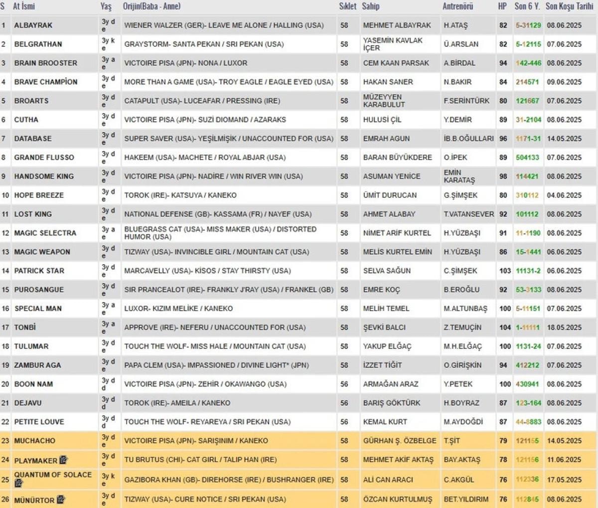 Bu yılki koşuya 22 asıl, 4 yedek olmak üzere toplam 26 tay kayıt yaptırdı. İşte 99. Gazi Koşusu’nda yarışacak atlar: