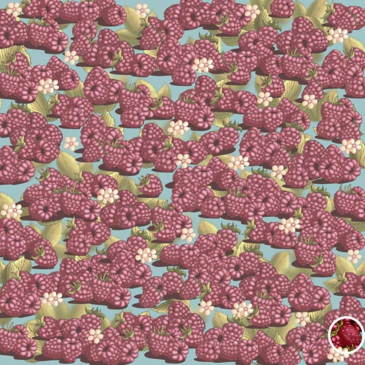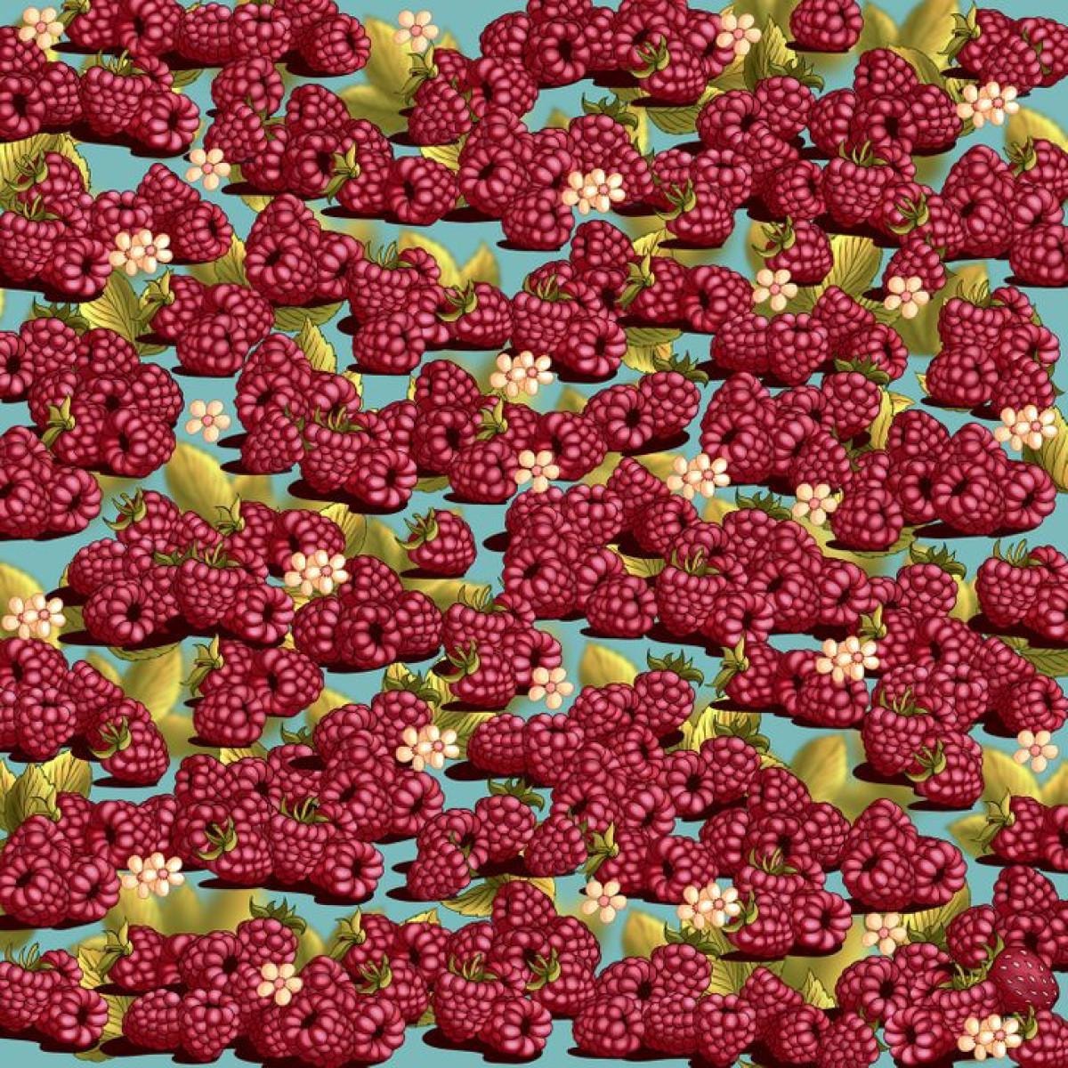 Peki, ahududularla dolu bu görselin içinde ustaca gizlenmiş bir çileği 5 saniyede bulabilir misiniz?