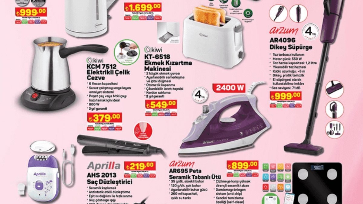 Elektronik mutfak eşyaları, saç bakım ürünleri, ütü, çaydanlık, tencere ve tava gibi marka ürünler dikkat çekiyor.