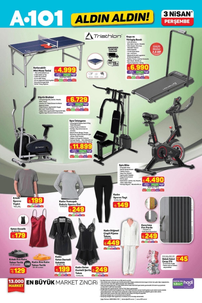 Türkiye’nin uygun fiyatlı market zinciri A101, 3 Nisan'da satışa sunacağı ürünleri duyurdu. Bu hafta indirimli ürünler arasında spor aletleri, beyaz eşya, mobilya, elektronik aletler yer alacak. İşte A101 3 Nisan Aktüel Ürünler…