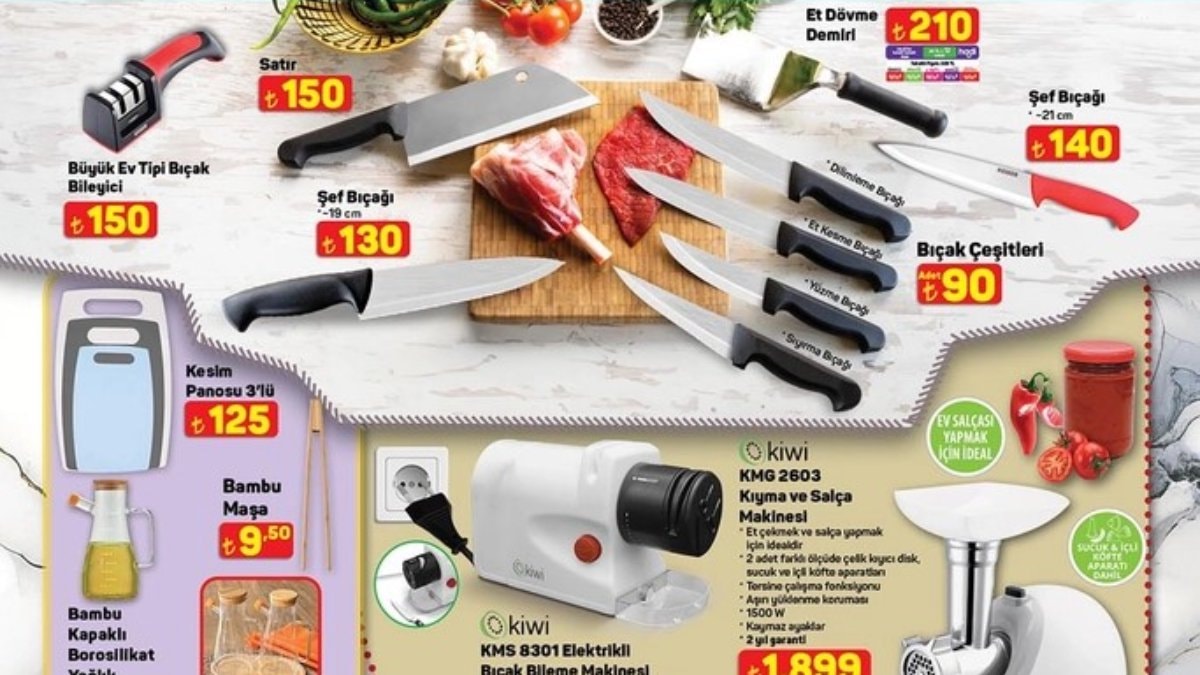 29 Mayıs Perşembe afişinde yer alan bıçak çeşitleri, bileyici, güveç, saklama kapları ve birçok malzeme uygun fiyatlarla satışa sunuluyor.