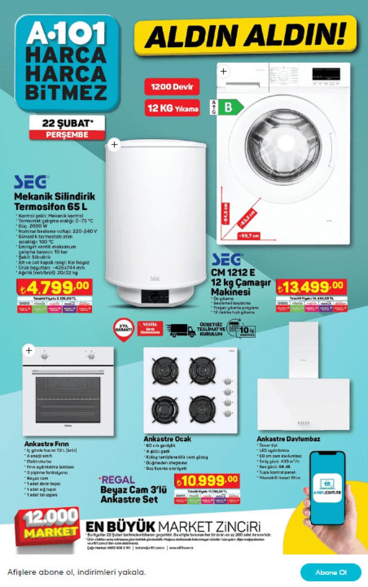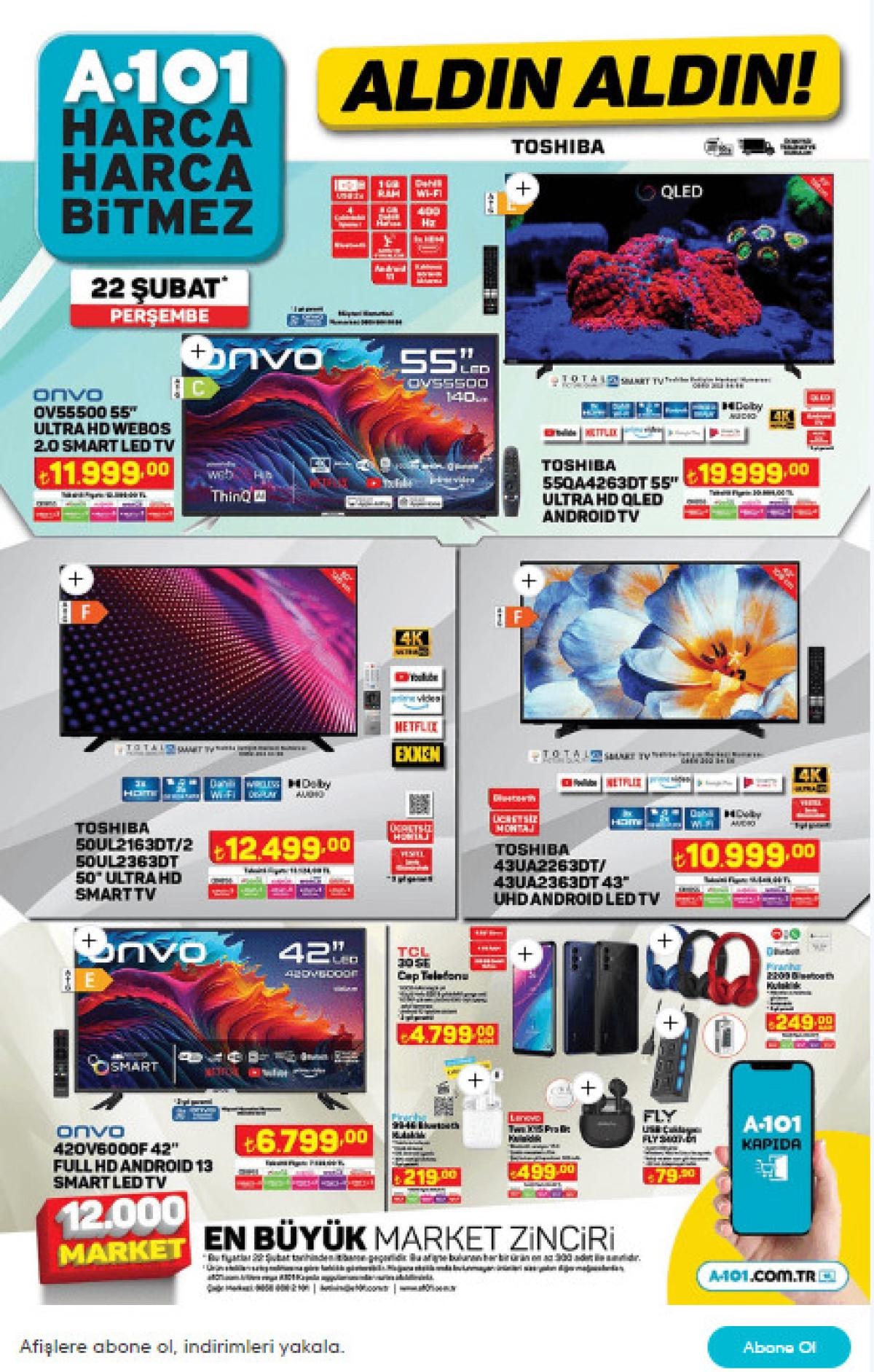 A101 22 Şubat 2024 güncel ürünler kataloğunda, Toshiba Smart TV'lerden SEG çamaşır makinesine, Regal cam ankastre setten halı yıkama makinesine kadar birçok seçenek mevcut.
