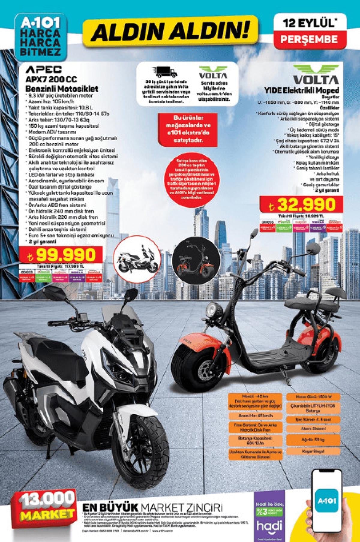 12 Eylül itibariyle A101 raflarında yerini alıyor. Ancak, aracı trafiğe çıkarmak için öncelikle trafik sigortanızı yaptırmanız ve bu işlemi A101’e bildirmeniz gerekiyor. Sonrasında ise yepyeni motosikletinizle yola çıkabilirsiniz.