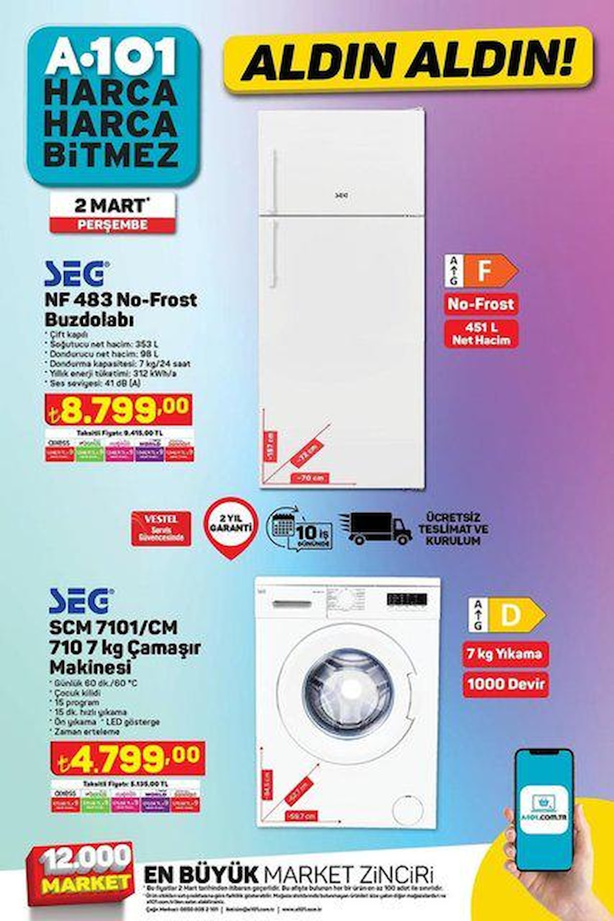 2 Mart Perşembe A101 aktüel ürünler kataloğunda yer alan; beyaz eşya çeşitleri, küçük ev aletleri, mutfak gereçleri, valiz ve kadife kaymaz saçaklı halıya kadar onlarca ürün indirimli fiyatıyla satışa çıkıyor. İşte, 2 Mart 2023 Perşembe A101 aktüel ürünler kataloğu tam fiyat listesi...