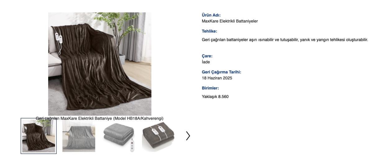 Battaniyeler aşırı ısınma nedeniyle yangın ve yanık tehlikesi oluşturduğu gerekçesiyle piyasadan geri çekiliyor.