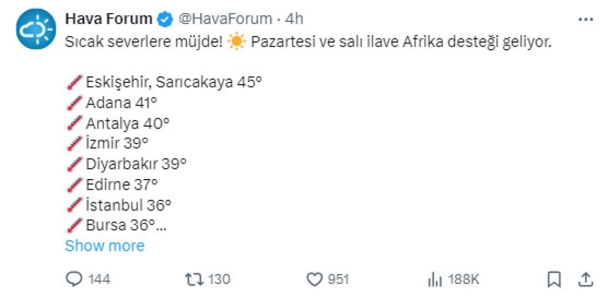 Hava Forum, sosyal medya resmi hesabından Pazartesi ve Salı günü Afrika üzerinden yeni bir dalga geleceğini duyurdu.