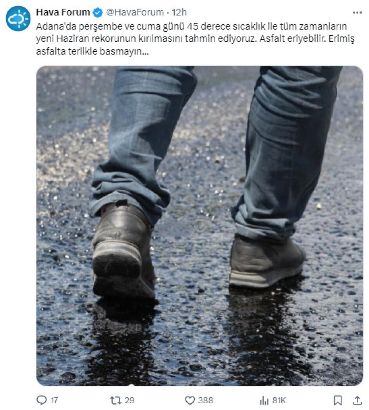 "Adana'da perşembe ve cuma günü 45 derece sıcaklık ile tüm zamanların yeni Haziran rekorunun kırılmasını tahmin ediyoruz. Asfalt eriyebilir. Erimiş asfalta terlikle basmayın..."