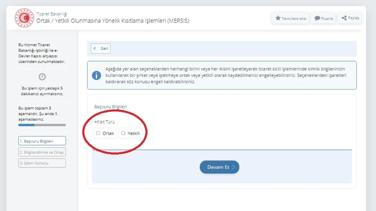 Kısıt türü olarak Ortak ve Yetkili seçeneklerinden birini ya da her ikisini de seçebilirsiniz. Seçiminizi yaptıktan sonra ise “Devam Et” butonuna tıklamalı ve istenen adımları izlemelisiniz.