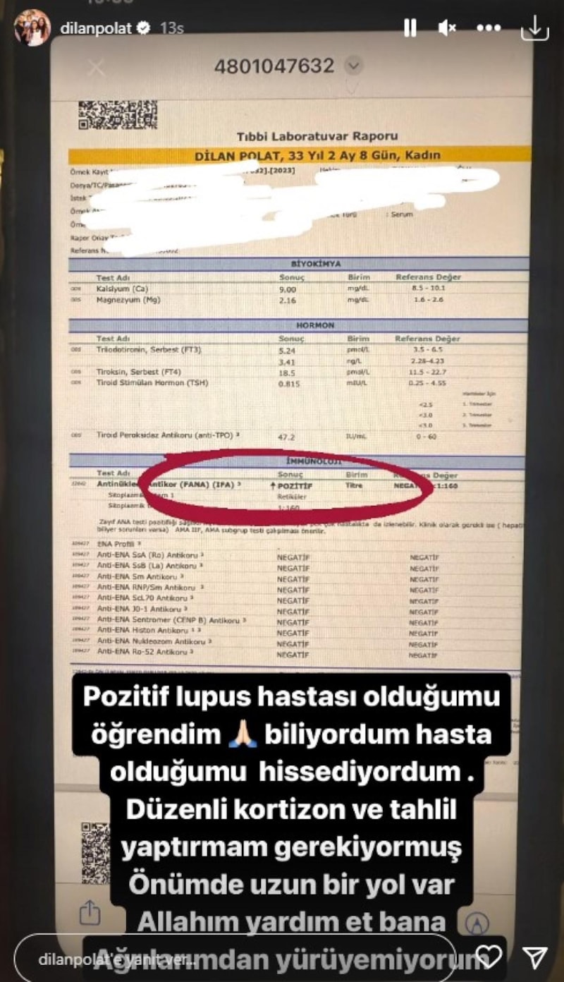 Instagram hesabından test sonucunu paylaşan Dilan Polat, "Pozitif Lupus hastası olduğumu öğrendim. Biliyordum hasta olduğumu hissediyordum. Düzenli kortizon ve tahlil yaptırmam gerekiyormuş. Önümde uzun bir yol var. Allah'ım yardım et bana ağrılarımdan yürüyemiyorum" dedi.