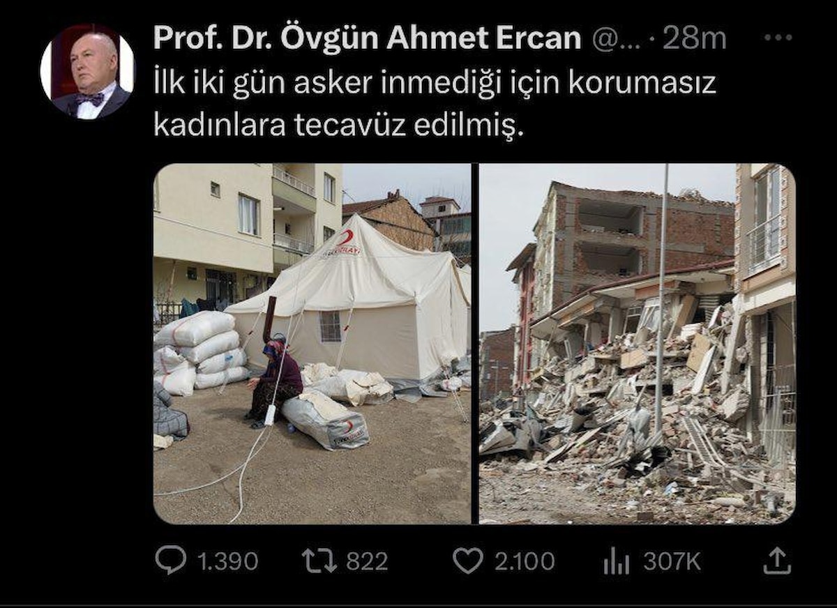 Ahmet Ercan sosyal medyadan yaptığı paylaşımda "İlk iki gün asker inmediği için korumasız kadınlara tecavüz edilmiş" ifadelerine yer vermişti.