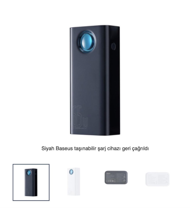 Ünlü teknoloji markası Baseus, 65W gücünde, 30000mAh kapasiteli taşınabilir şarj cihazlarını acil olarak geri çağırma kararı aldı.