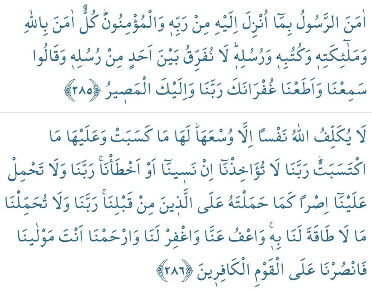 Lâ yükellifu(A)llâhu nefsen illâ vus'ahâ(c) lehâ mâ kesebet ve'aleyhâ me-ktesebet(k) rabbenâ lâ tu-âḣiżnâ in nesînâ ev aḣta/nâ(c) rabbenâ velâ tahmil 'aleynâ isran kemâ hameltehu 'ale-lleżîne min kablinâ(c) rabbenâ velâ tuhammilnâ mâ lâ tâkate lenâ bih(i)(s) va'fu 'annâ vaġfir lenâ verhamnâ(c) ente mevlânâ fensurnâ 'ale-lkavmi-lkâfirîn(e) (Bakara-286)