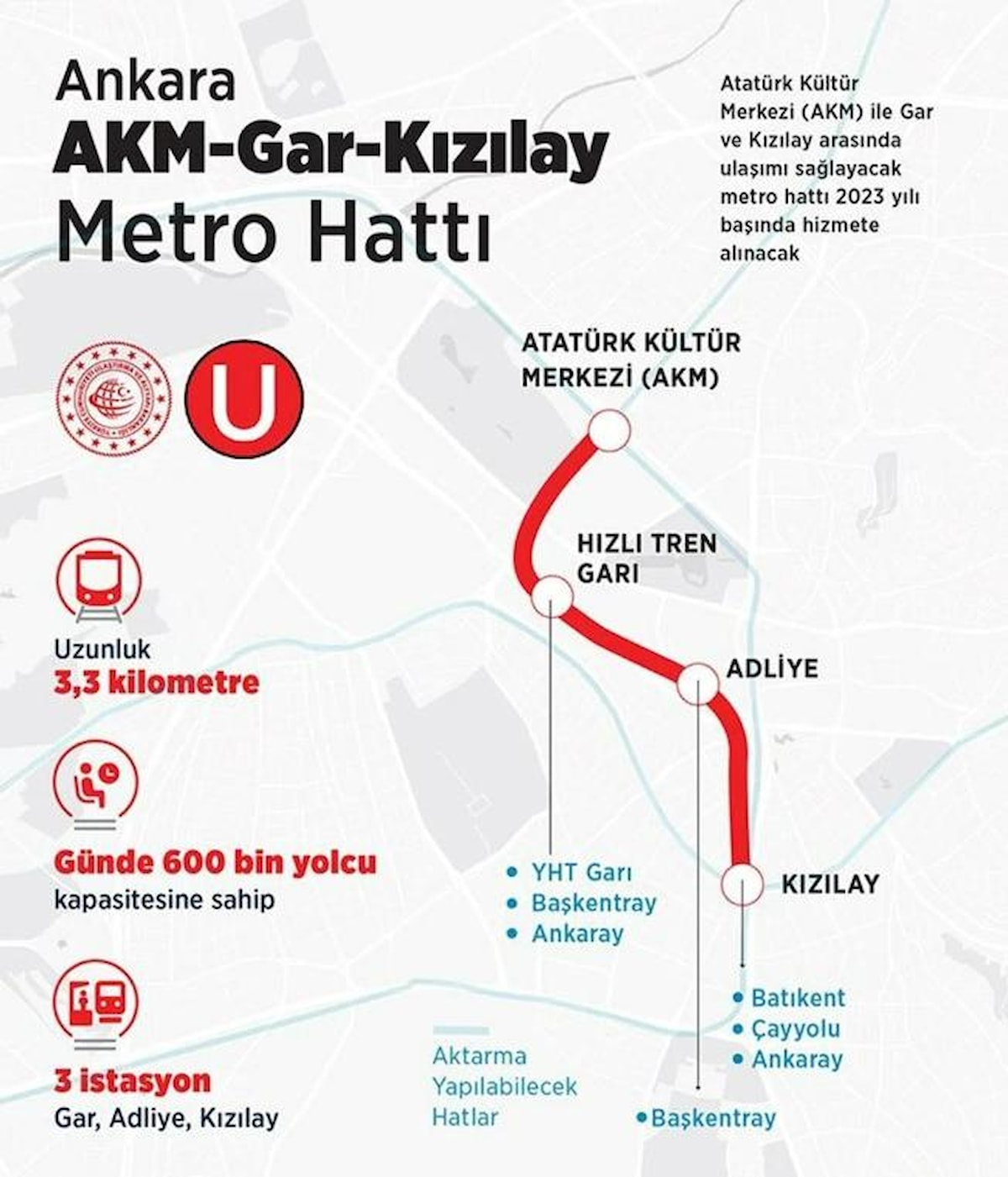 Ulaştırma ve Altyapı Bakanlığı, AKM-Gar-Kızılay Metro Hattı' 12 Nisan bugün) 2023 tarihinde açılacağını duyurdu. Cumhurbaşkanı Recep Tayyip Erdoğan'ın katılımıyla gerçekleşecek olan açılış töreni saat 14.00'de başlayacak.