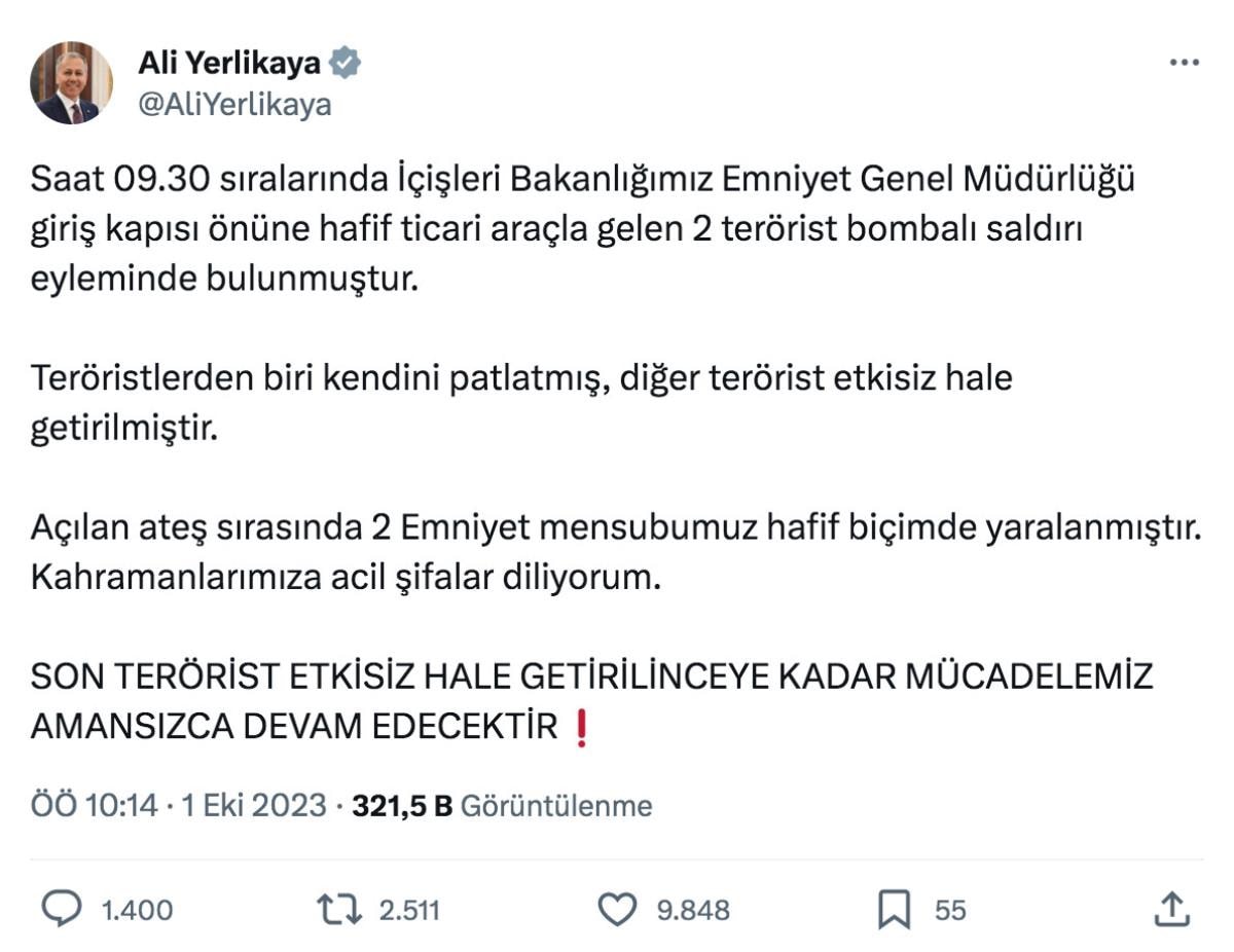 "Saat 09.30 sıralarında İçişleri Bakanlığımız Emniyet Genel Müdürlüğü giriş kapısı önüne hafif ticari araçla gelen 2 terörist bombalı saldırı eyleminde bulunmuştur.