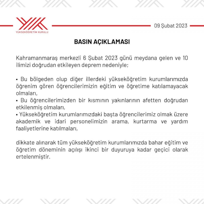"Sevgili Öğrencilerimiz, Ülkemizde yaşanan deprem nedeniyle 11-12 Şubat 2023 tarihlerinde gerçekleşecek olan Bütünleme Sınavı tüm Türkiye ve Bakü için ileri bir tarihe ertelenmiştir."