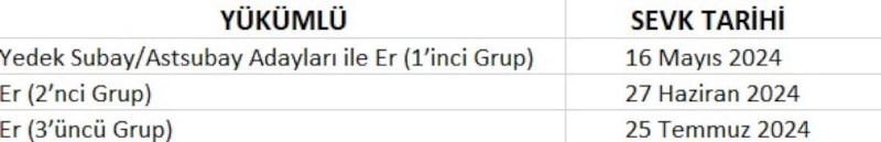 Yedek subay/astsubay adayları ile erlerin sevk tarihleri aşağıdaki tabloda yer almaktadır.