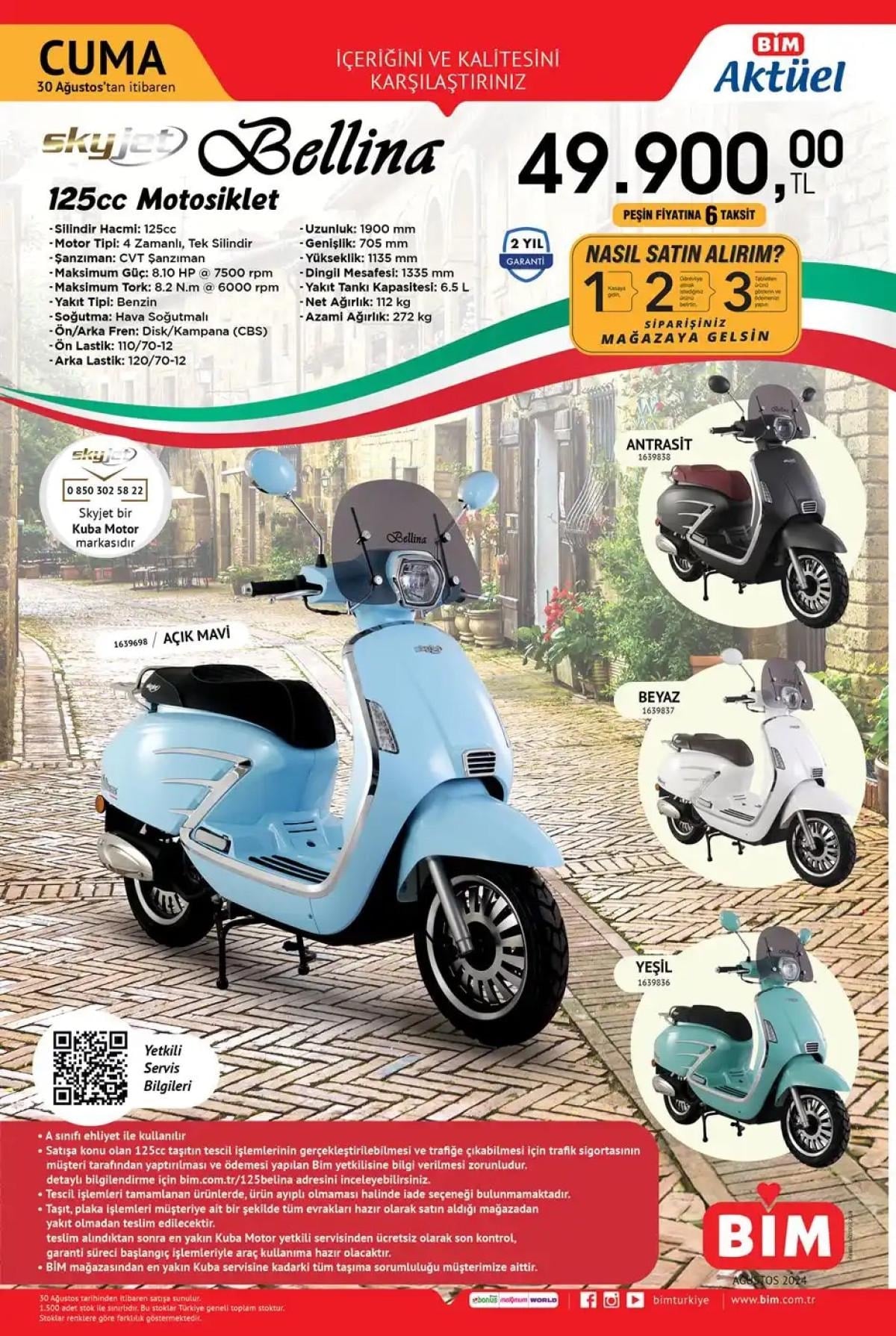 Skyjet markasının Bellina 125cc motosikleti, sadece 49.900 TL peşin fiyatıyla BİM Bolu marketlerinde satışa sunulacak.