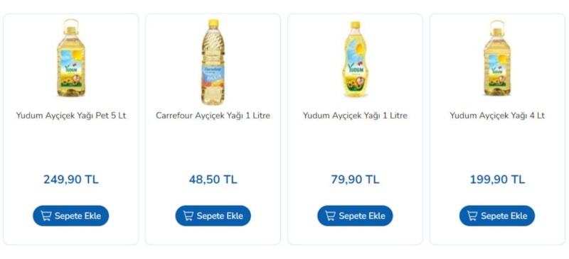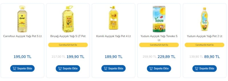 CarrefourSA mağazalarında, 5 litrelik ayçiçek yağı fiyatları 139 TL'den 89 TL'ye düşerek alışveriş listelerinin başına yerleşti.