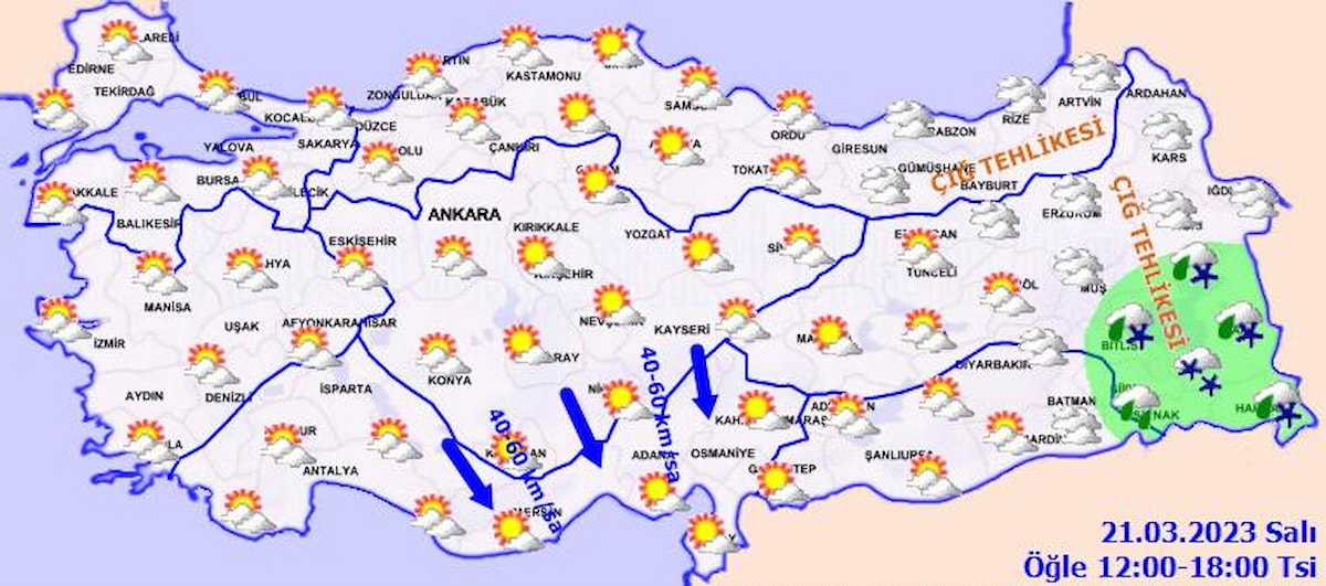 KUVVETLİ RÜZGÂR UYARISI: Rüzgârın; Doğu Akdeniz’in iç kesimleri ve İç Anadolu'nun güneydoğusunda kuzeyli yönlerden kuvvetli (40-60 km/saat) esmesi beklendiğinden yaşanabilecek olumsuzluklara karşı dikkatli ve tedbirli olunmalıdır.
