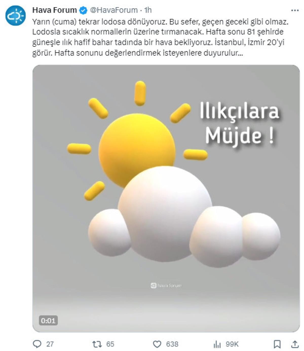 "Yarın (cuma) tekrar lodosa dönüyoruz. Bu sefer, geçen geceki gibi olmaz. Lodosla sıcaklık normallerin üzerine tırmanacak. Hafta sonu 81 ilde güneşle ılık hafif bahar tadında bir hava bekliyoruz. İstanbul, İzmir 20'yi görür. Hafta sonunu değerlendirmek isteyenlere duyurulur."