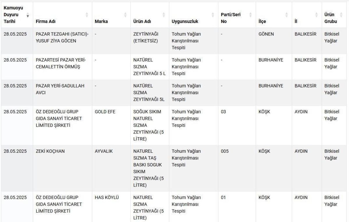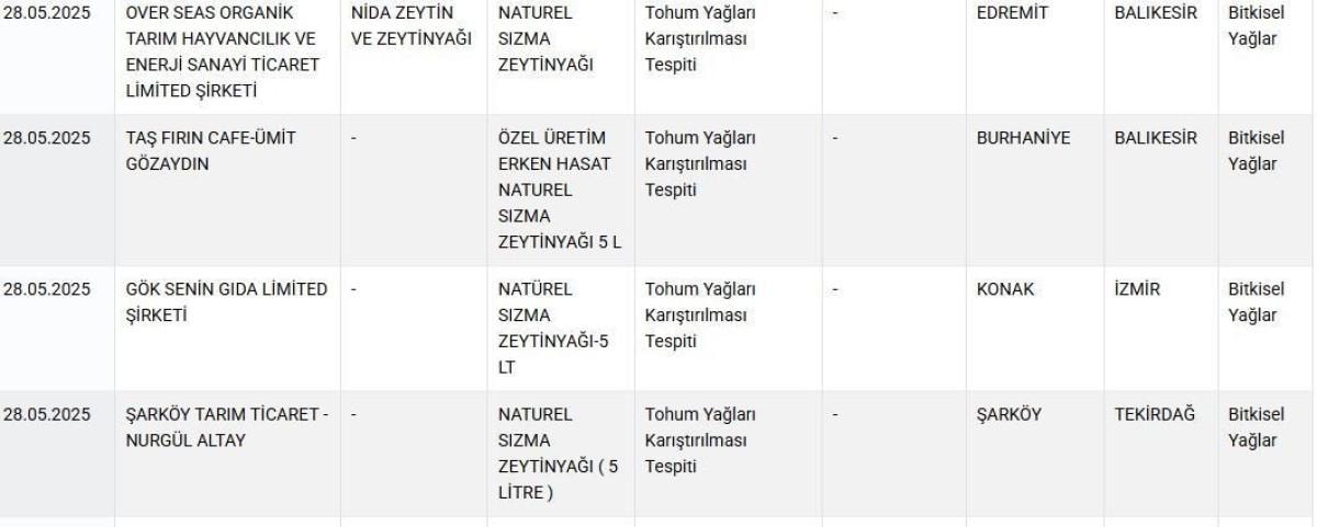 Bakanlığın resmi internet sitesi üzerinden yayımlanmaya devam eden taklit ve tağşiş listesi ise yapılan denetimler sonucunda her geçen gün uzamaya devam ederken listede yapılan son güncellemeyle birlikte 13 zeytinyağı markası daha ifşalandı.
