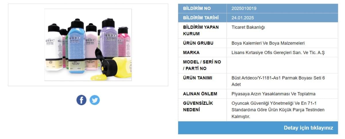 Boya kalemleri ise “Oyuncak Güvenliği Yönetmeliği ve EN 71-1 Standardına Göre Ürün Küçük Parça Testinden Kalmıştır.” gerekçesiyle yasaklandı.