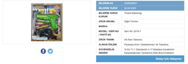 Bakanlık tarafından yapılan incelemeler sonucunda 'Ok Atan Tabanca' isimli oyuncağın içeriğinde kimyasal madde oranının yüksek olduğu, çocuk sağlığı üzerinde olumsuz etkiler yaratabileceği saptandı.