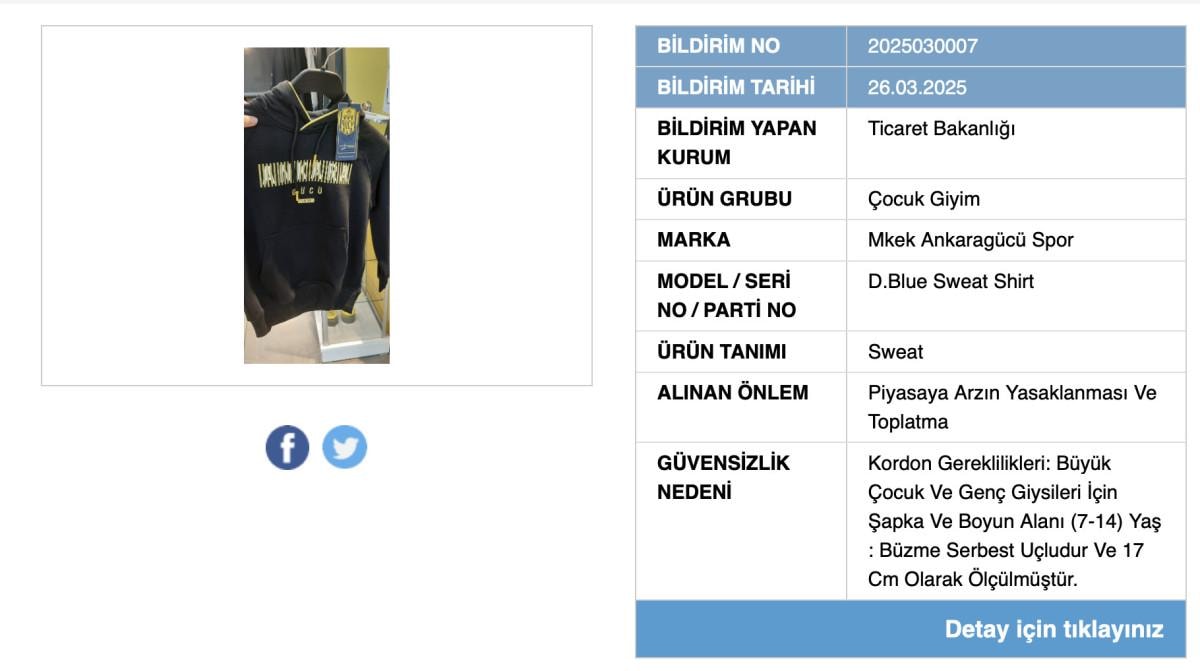 Bakanlık, bebek ve çocuk ürünlerinde sıkça karşılaşılan güvenlik sorunları nedeniyle bu kez Ankaragücü Spor’un çocuklar için ürettiği sweatshirt’e müdahale etti.