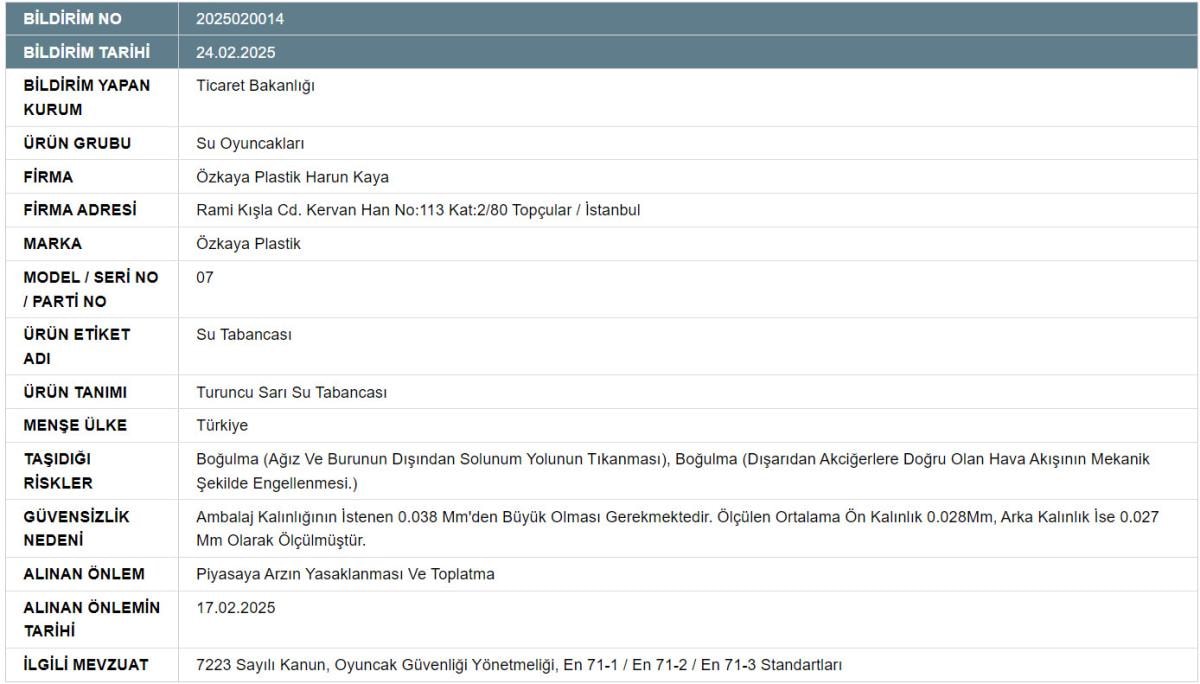 Özkaya Plastik markasına ait su tabancası, boğulma riski taşıdığı gerekçesiyle piyasadan toplatılmaya başlandı. Bakanlık, oyuncağın satışının yasaklandığını duyurdu.
