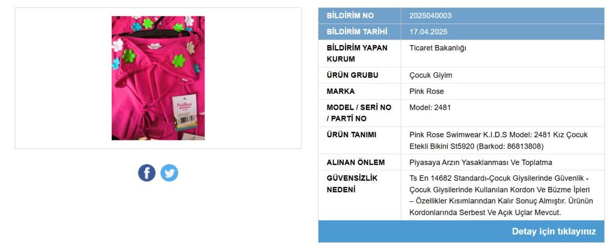Yapılan incelemeler sonucunda “Pink Rose” markasına ait “Kız Çocuk Etekli Bikini” ürünün piyasa arz edilmesi yasaklanırken hali hazırda satışı yapılan ürünlerinde toplatılmasına karar verildi.