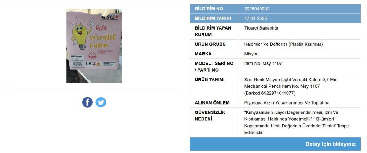Giyim ürünün yanı sıra “Misyon” markasına ait “Sarı Renk Misyon Light Versatil Kalem” ürünün de piyasa arz edilmesi yasaklanırken hali hazırda satışı yapılan ürünlerinde toplatılmasına karar verildi.