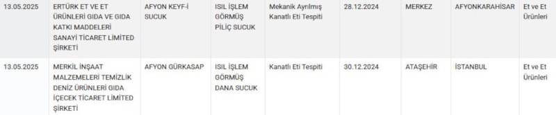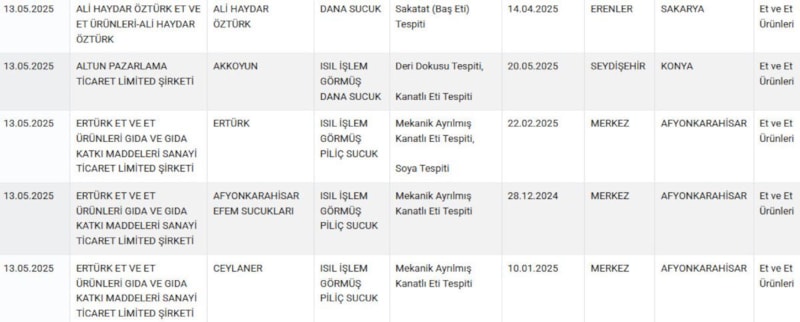 Bakanlık tarafından yapılan denetimler sonucunda listeye son olarak Sakarya, Konya, Afyonkarahisar ve İstanbul merkezli üretim gerçekleştiren firmalar dahil edilirken, hileli üretim yaptığı duyurulan firmalar arasında marketlerde satışa sunulan ünlü sucuk markası da yer aldı.