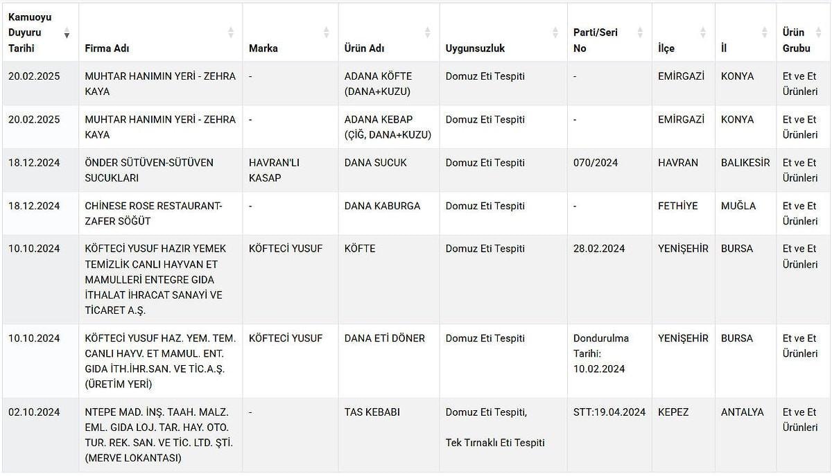 Türkiye Gazetesi'nde yer alan habere göre, 'Sağlığı Tehlikeye Düşürecek Gıdalar' listesinde yapılan güncellemenin ardından, Türkiye genelinde şu ana kadar 7 işletmede domuz eti satıldığı tespit edildi.