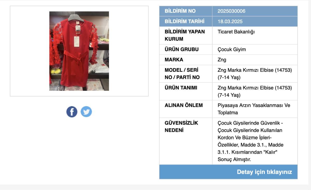 Bakanlığın yayınladığı listeye göre, Zng markasına ait 7-14 yaş kırmızı elbisede güvensizlik tespit edildi.