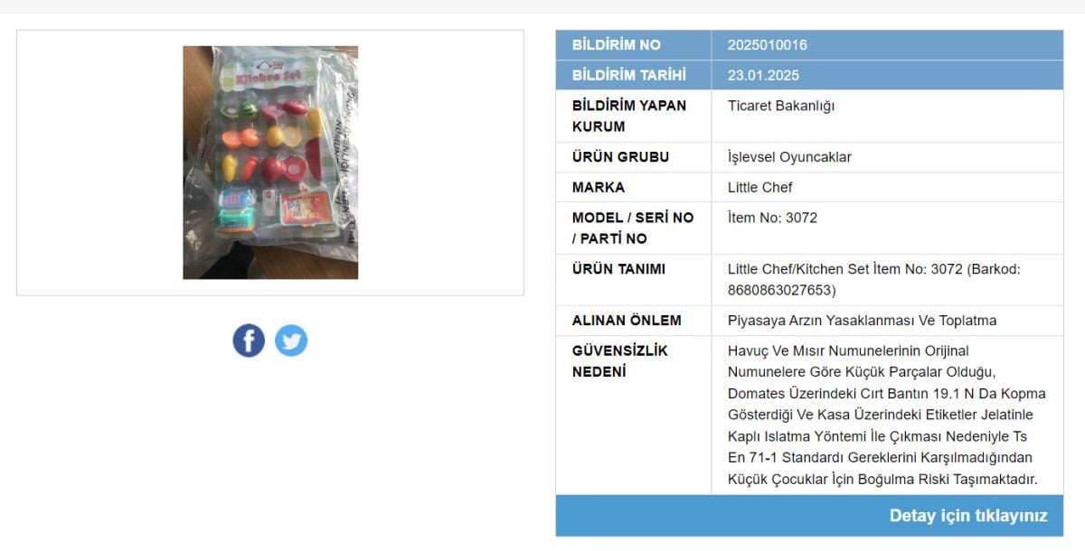 Diğer iki ürün ise mutfak seti ve zıplama topları olarak kayda geçti. Bakanlık, bu ürünlerin piyasadan toplanacağı ve satışlarının yasaklanacağı bilgisini verdi.