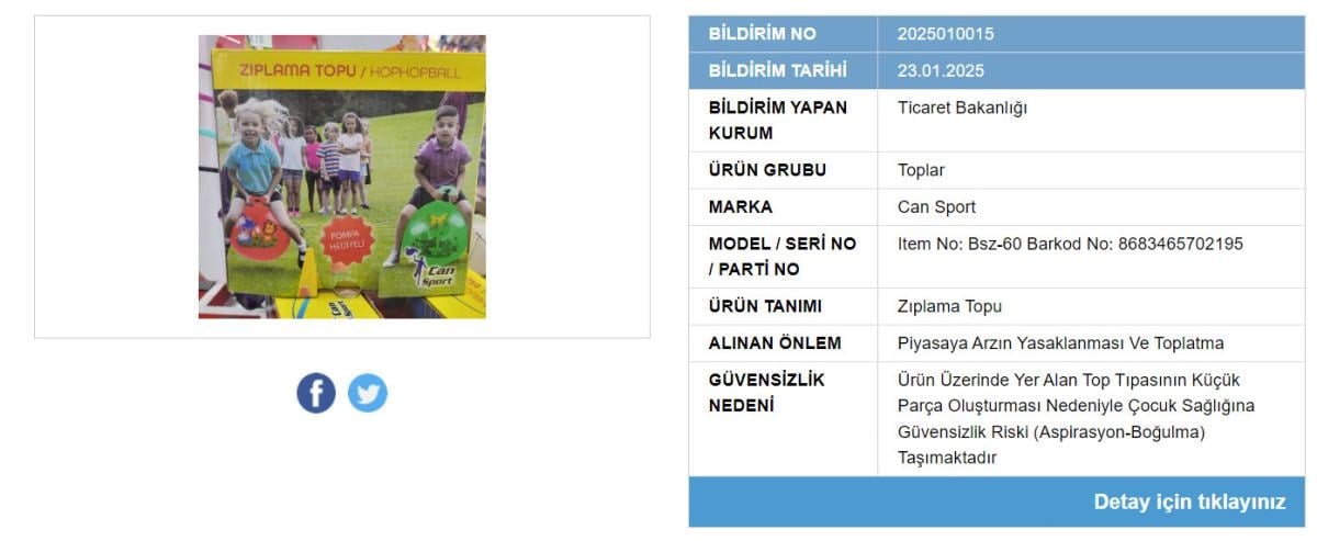 Öte yandan, Can Sport tarafından satılan zıplama toplarının da güvensiz olduğuna dikkat çekildi. Üründeki top tıpasının küçük parçalara ayrılabilmesi nedeniyle boğulma riski taşıdığı ifade edilerek, bu ürünün de güvenlik standartlarını karşılamadığı belirtildi.
