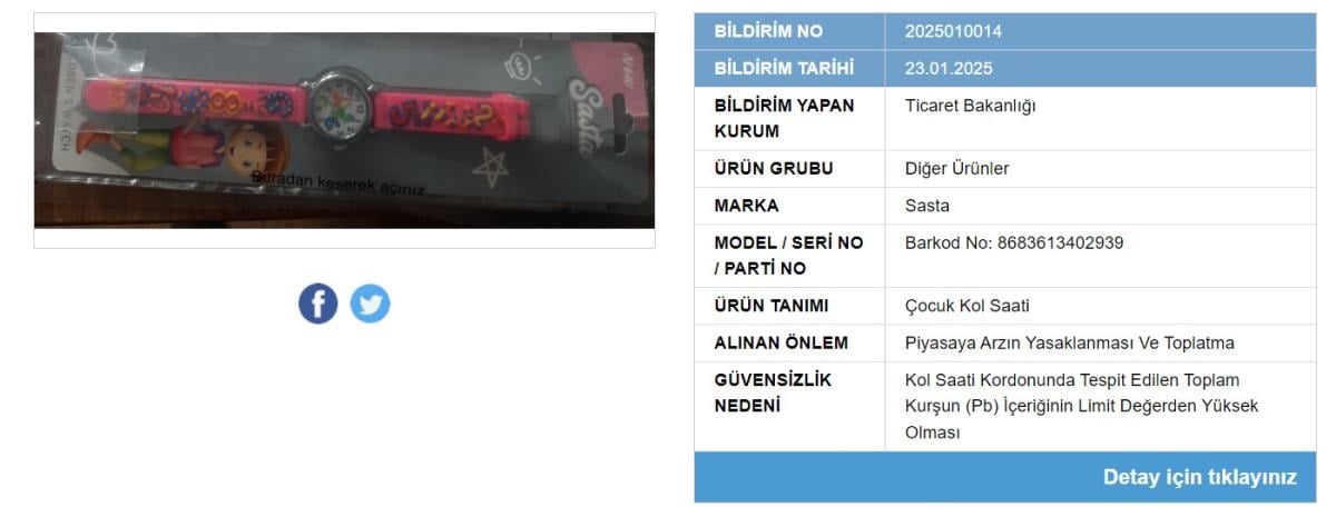 Bu ürünlerden biri çocuk kol saati olup, kurşun seviyesinin normalin üzerinde olduğu belirtilerek ailelere uyarı yapıldı.