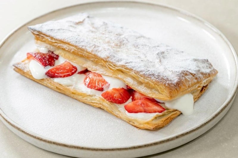 İncecik çıtır milföy katlarının arasında krem şanti ve taze çileklerle yapılan bu tatlı, hem göz alıcı hem de hafif. Sıcakta ağır şerbetli tatlılardan kaçanlar için ideal.