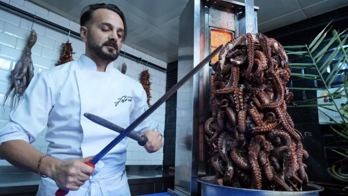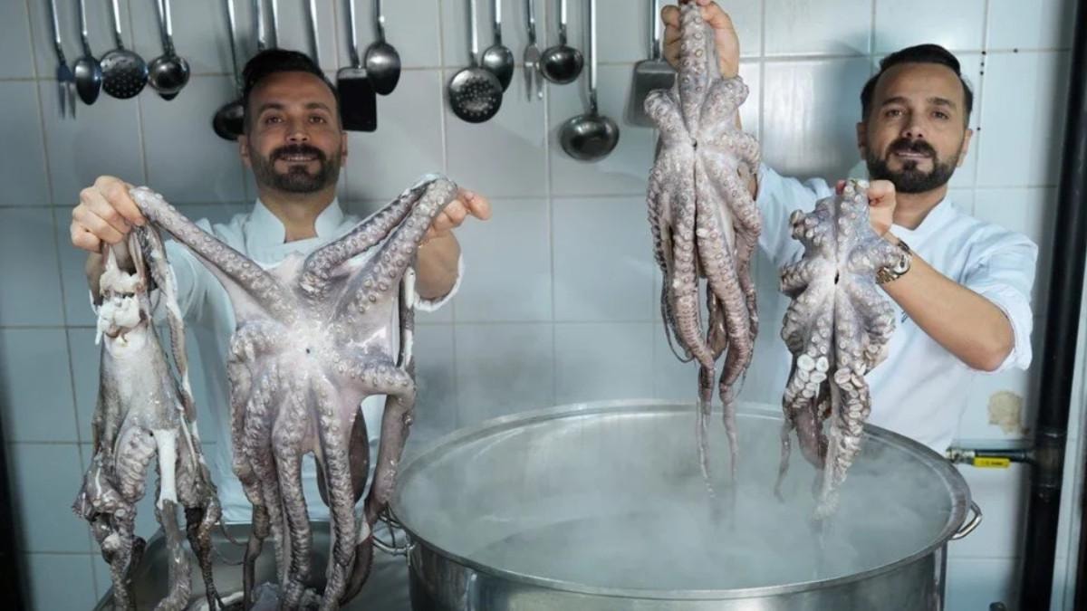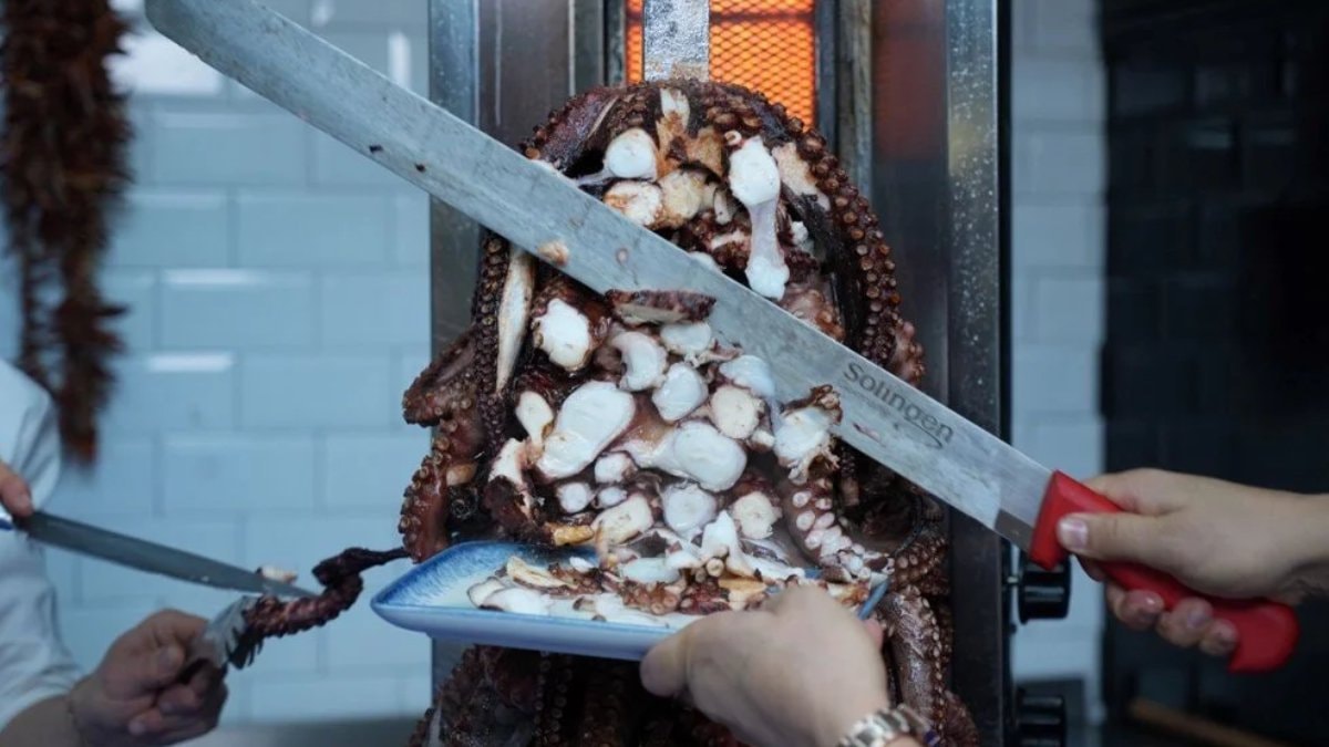 Türk mutfağının zengin tatlarını deniz ürünleriyle birleştiren şef kardeşler, daha önce sundukları levrek şiş, simit levrek ve orkinos dönerinin ardından ahtapot döneri ile dikkatleri üzerine çekiyor.