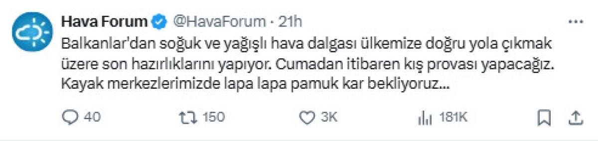 Meteoroloji kaynağı Hava Forum, X hesabından yaptığı paylaşımla kışı müjdeledi.